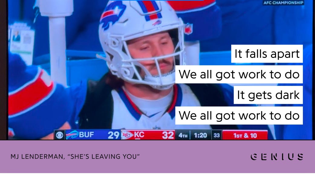 The Buffalo Bills' season ended last week, and ended as it has four of the past five seasons, in a loss to the Kansas City Chiefs. While the loss has produced in other fans a sense of impotent rage, or paranoid conspiracies that the league is out to get them, this latest loss made me feel only a bone deep sense of existential futility. No matter what happens, play well, play poorly, play at home, play on the road, lead late, trail late, it all ends the same, and a future of it ending the same stretches out ceaselessly in front of me. It’s enough to make one turn to Beckett, pull up their favorite emo anthems of the 2010s (I had a chance to construct something beautiful / And I choked, I choked / I choked, I choked!!!), and simply wallow in the cold, indifferent universe.1