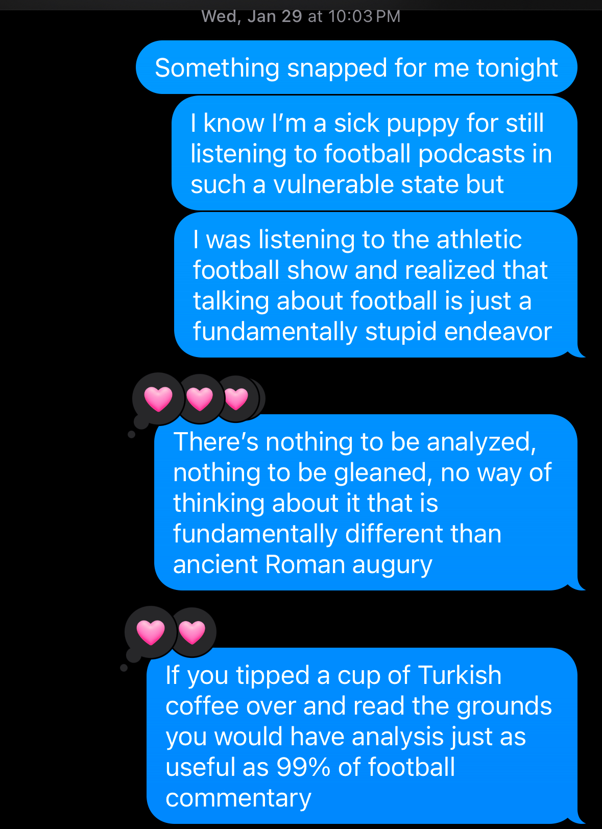 For somewhere around two decades, a friend of my dad’s has been running a football picks competition - a so called ‘confidence’ pool - among family and friends. It’s important to note that absolutely no money is at stake here, just bragging rights in the form of your picture on the pool website for a year after you win.2 In the past couple years, I’ve started getting my own football-loving friends into the pool, giving us a nice diversion from fantasy football and sports gambling; the only thing that matters in the pool is whether you know ball or not, and whether you can remember to get your picks in on time. (The NFL played a game on every day of the week except Tuesday this season, so it can be tough to keep up with.) Since I was the one who got my friends into the pool, I figured I should also be the one to remind them to make their picks, as forgetting a week will basically sink you. At first, my reminder texts were simple, and to the point: every Thursday morning, I’d send a message along the lines of ‘don’t forget your picks, lads’ and then go on with my day.